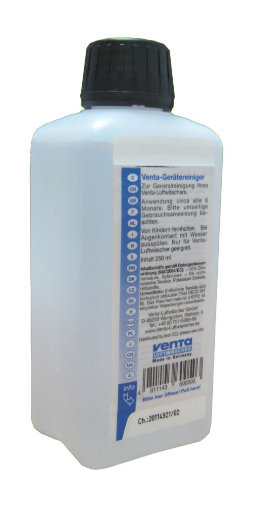 Очиститель для прибора VENTA был специально разработан для очистителей увлажнителей воздуха VENTA. Эта добавка представляет собой комплекс элементов, направленных на очистку прибора от налета кальция и других примесей из воды. Основным действующим веществом является лимонная кислота и ее производные. В процессе эксплуатации прибор Venta сильно загрязняется, причем не всегда грязь можно удалить просто промывая прибор под душем. Для этого и существует «Venta-Reiniger» (Очиститель для прибора), который удаляет любую грязь.